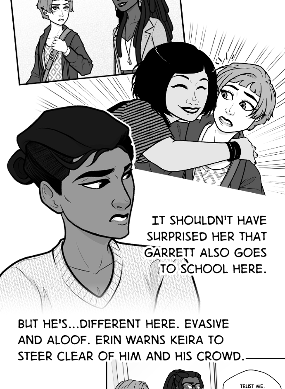 It’s Keira’s first day at a new high school. She’s shown around by Erin and her friend Rhys. It shouldn’t have surprised her that Garrett also goes to school here.