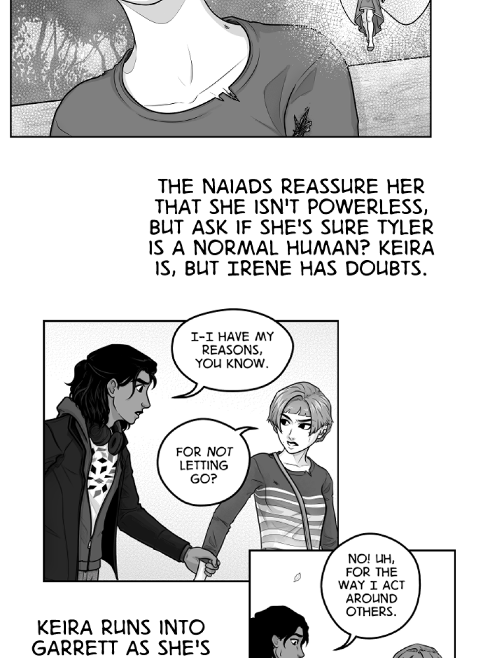Keira is saved from being (accidentally?) drowned by aquatic beings. She and Garrett bond over this experience. After Garrett leaves, her assailants return to apologize and introduce themselves as Leila and Loni, sibling naiads. They seem genuine, but Keira is still wary of them.
